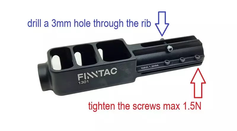 • mocowany na lufe za pomocą obejmy (wymagane wykonanie 1 otworu o średnicy 3mm na szynie lufy)